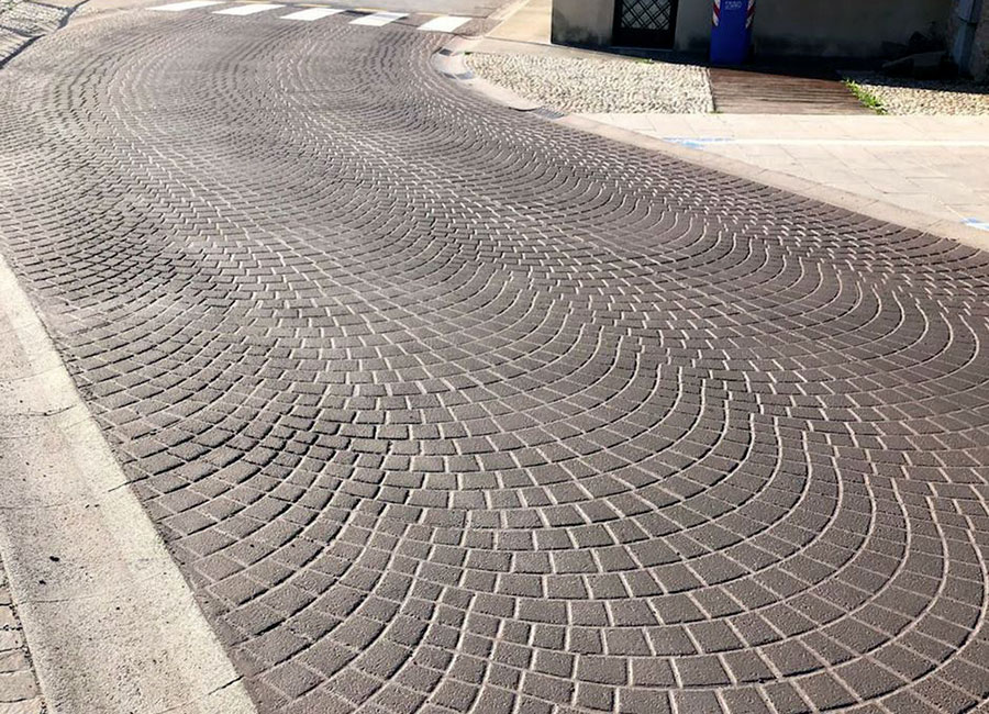 L’asfalto stampato consente di realizzare superfici decorative durevoli e antiscivolo, ideali per valorizzare aree urbane senza rinunciare alla robustezza dell’asfalto.
